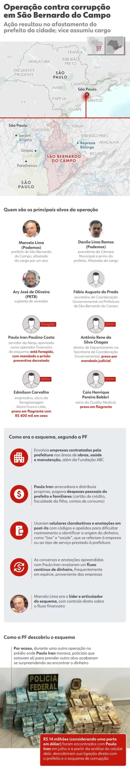 Segundo denúncia do Ministério Público, o esquema investigado teve início em 2022 e envolvia vereadores, secretários, servidores e empresários. A organização criminosa fraudava contratos da Prefeitura e da Fundação ABC para desviar recursos públicos.