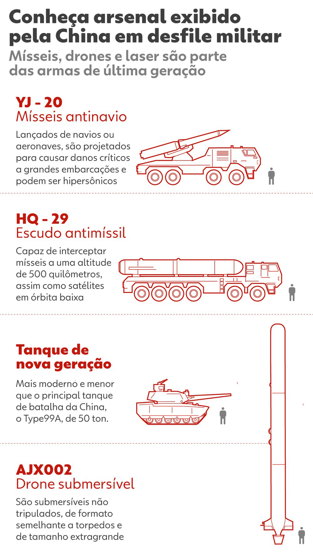 A parada exibiu novas armas de última geração, incluindo mísseis balísticos intercontinentais reformulados (DF-5C), com alcance estimado de 20 mil km, e um novo modelo móvel de longo alcance, o DF-61. Também foram mostrados mísseis hipersônicos, drones navais, tanques modernizados e sistemas de defesa aérea.