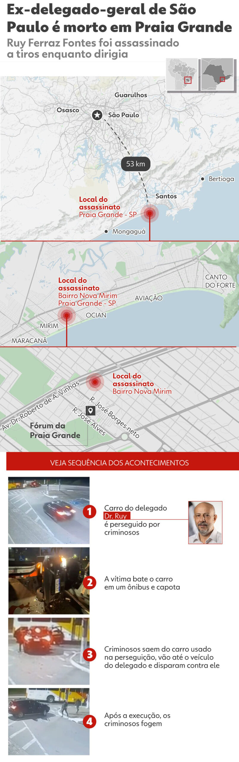 O ex-delegado-geral da Polícia Civil de São Paulo e atual secretário de Administração de Praia Grande, Ruy Ferraz Fontes, de 66 anos, foi morto a tiros no fim da tarde desta segunda-feira (15), no litoral paulista. Fontes dirigia seu carro pela Avenida Dr. Roberto de Almeida Vinhas, no bairro Nova Mirim, quando criminosos desceram de outro veículo e efetuaram diversos disparos.