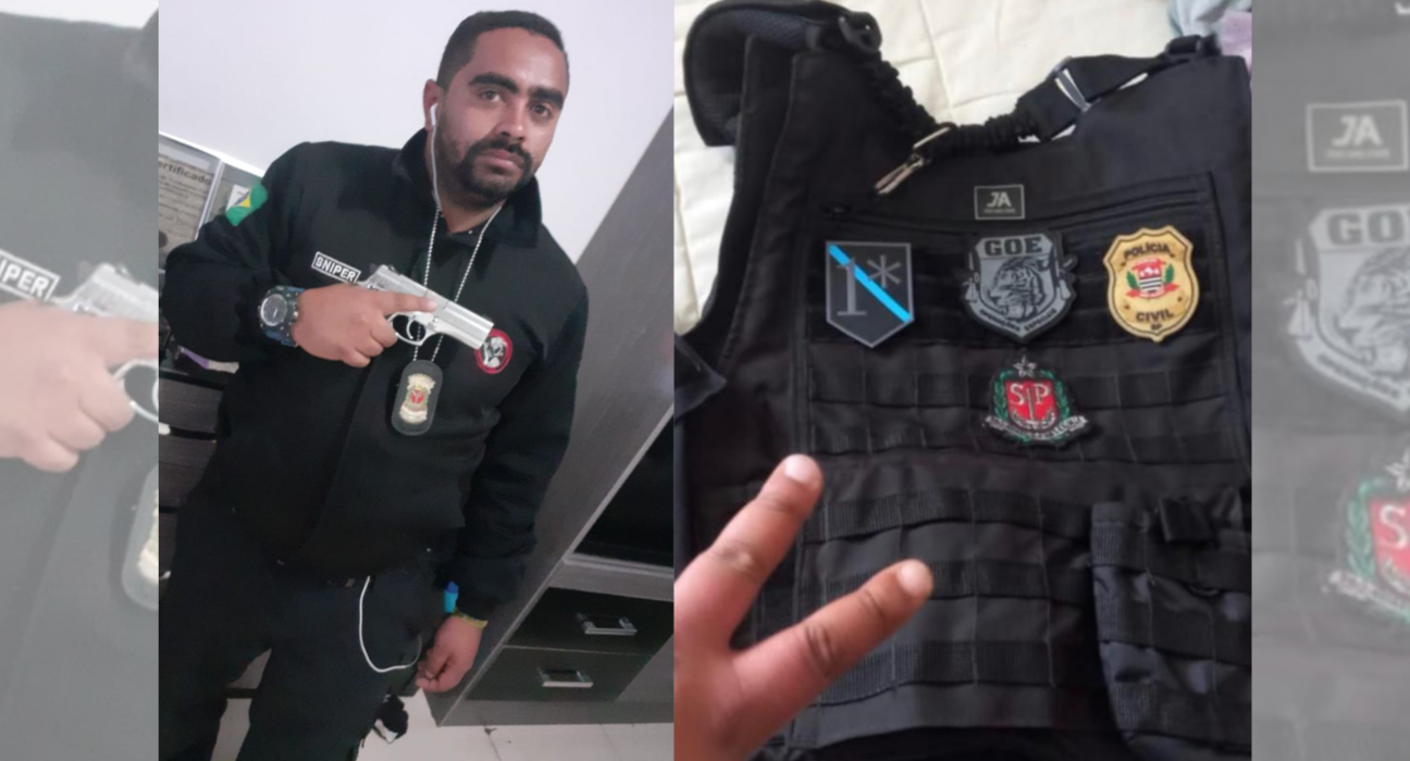 O homem, identificado como Peter William de Castro Silva, foi flagrado no local onde atuava. Uma arma de fogo de uso restrito foi apreendida, registrada em seu nome. Além disso, no veículo do indiciado, foram encontradas três réplicas de arma airsoft, um par de algemas e uma carteira com o brasão do Estado de São Paulo.